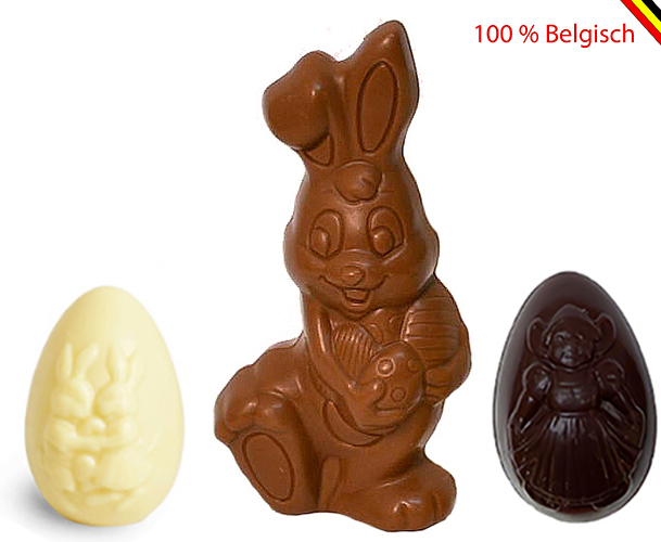 Easter package consisting of a modern fun Easter bunny made from Belgian Callebaut chocolate and two Easter eggs.