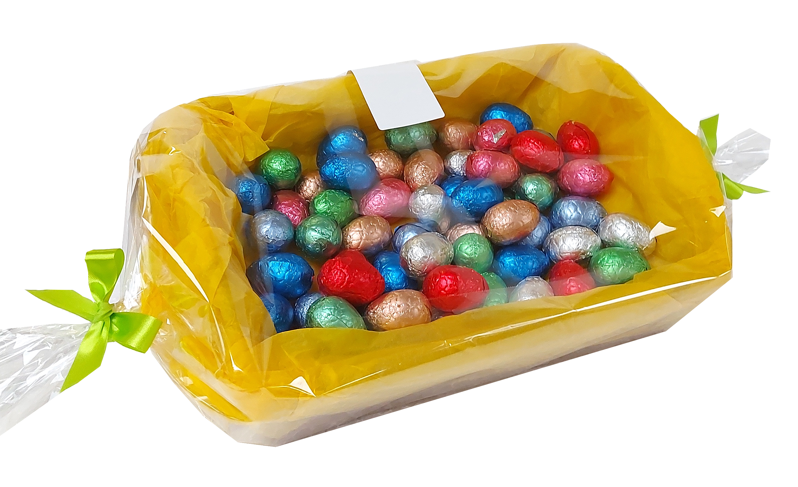 An Easter basket filled with 60 individually wrapped Callebaut chocolate eggs.