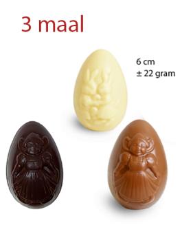 Op de achterzijde staat de wettelijke info, op de voorzijde kan u uw paasboodschap en/of uw logo laten plaatsen. Dit is een gratis service die we aanbieden. De ruimte hiervoor is 3.6 cm breed en 3.7 cm hoog. De hoofdkleur dient wit te zijn (achtergrond). Standaard gebruiken we het afgebeelde paashaasje. Enkele voorbeelden van personalisatie kan u bij de foto's terugvinden.