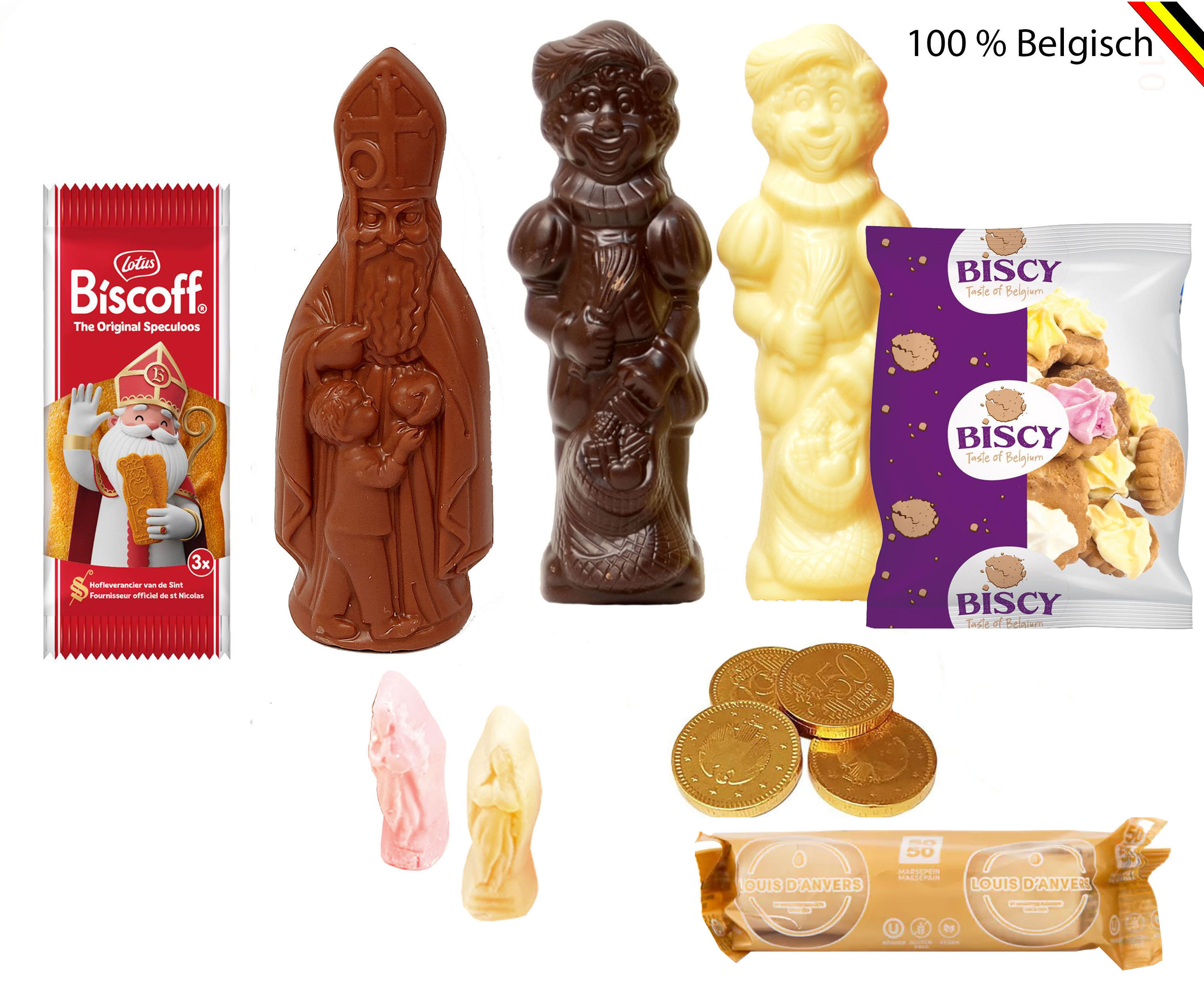Een royaal en feestelijk Sinterklaasgeschenk voor 2025, boordevol Belgische lekkernijen. Dit extra gevulde pakket bevat drie chocoladefiguren in melk, puur en witte Callebaut chocolade, samen met een selectie van traditionele Sintlekkernijen: Lotus speculoos, chocolade munten, guimauve, artisanale marsepein en Ice Gems koekjes. Alles wordt verpakt in een kraft- of mica zakje, met gratis personalisatie.